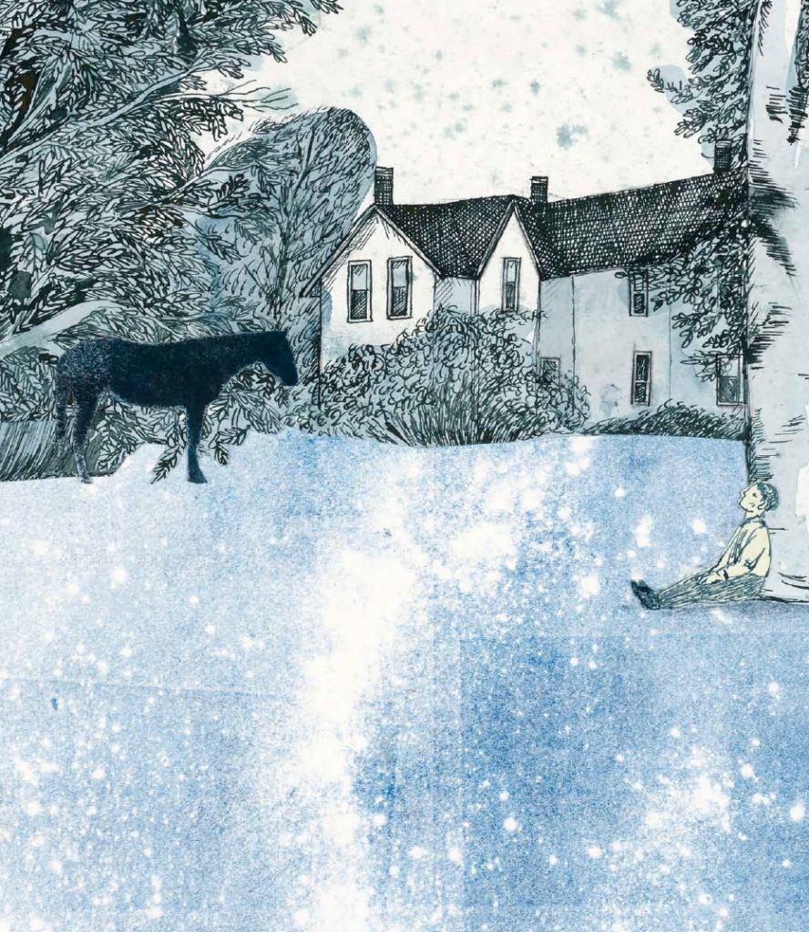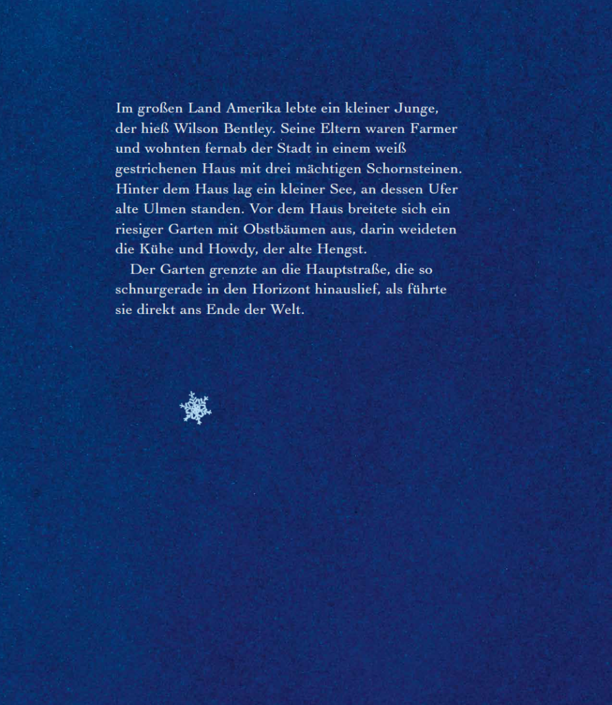 Im großen Land Amerika lebte ein kleiner Junge, der hieß Wilson Bentley. Seine Eltern waren Farmer und wohnten fernab der Stadt in einem weiß gestrichenen Haus mit drei mächtigen Schornsteinen. Hinter dem Haus lag ein kleiner See, an dessen Ufer alte Ulmen standen. Vor dem Haus breitete sich ein riesiger Garten mit Obstbäumen aus, darin weideten die Kühe und Howdy, der alte Hengst. Der Garten grenzte an die Hauptstraße, die so schnurgerade in den Horizont hinauslief, als führte sie direkt ans Ende der Welt.