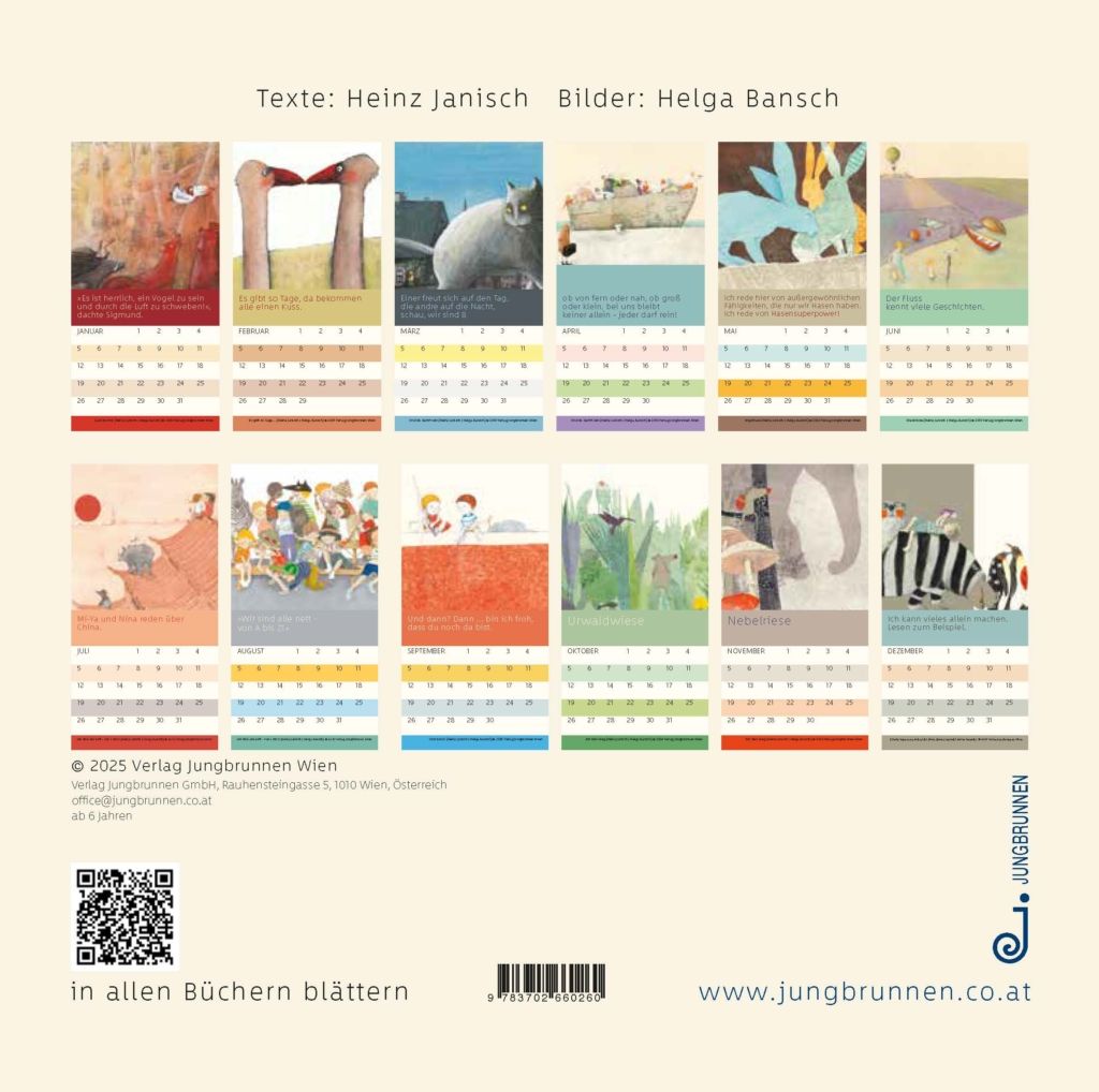 Dieser immerwährende Kalender bietet Platz für viele Geburtstagskinder: Mit farbenfrohen, humorvollen Bildern von Helga Bansch und poetischen Zitaten von Heinz Janisch vereint er das Beste aus 25 Jahren Zusammenarbeit des preisgekrönten Erfolgsteams. Ein Muss für alle Bansch-Janisch-Fans und die, die es noch werden wollen.